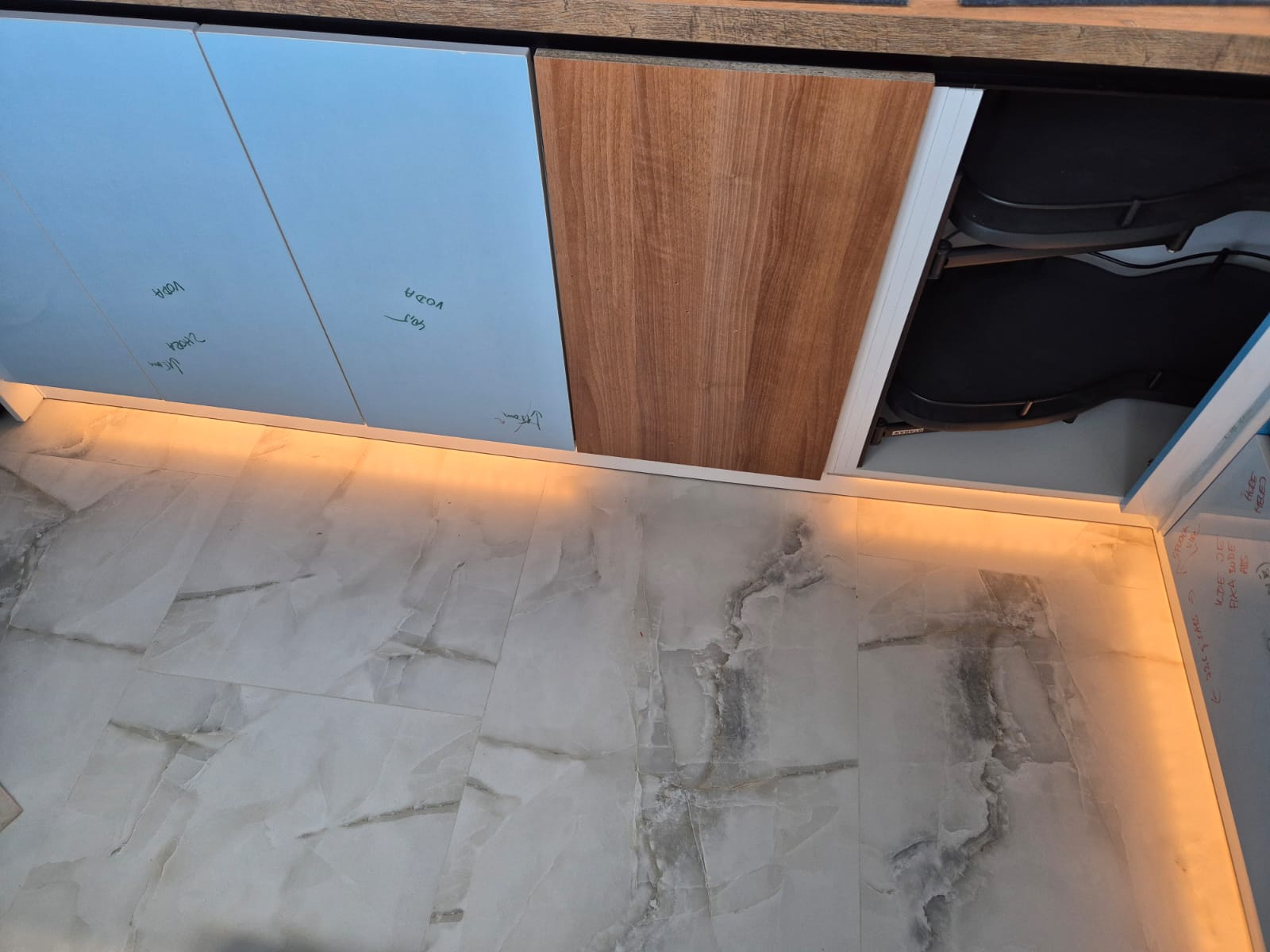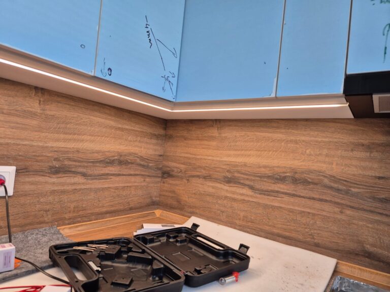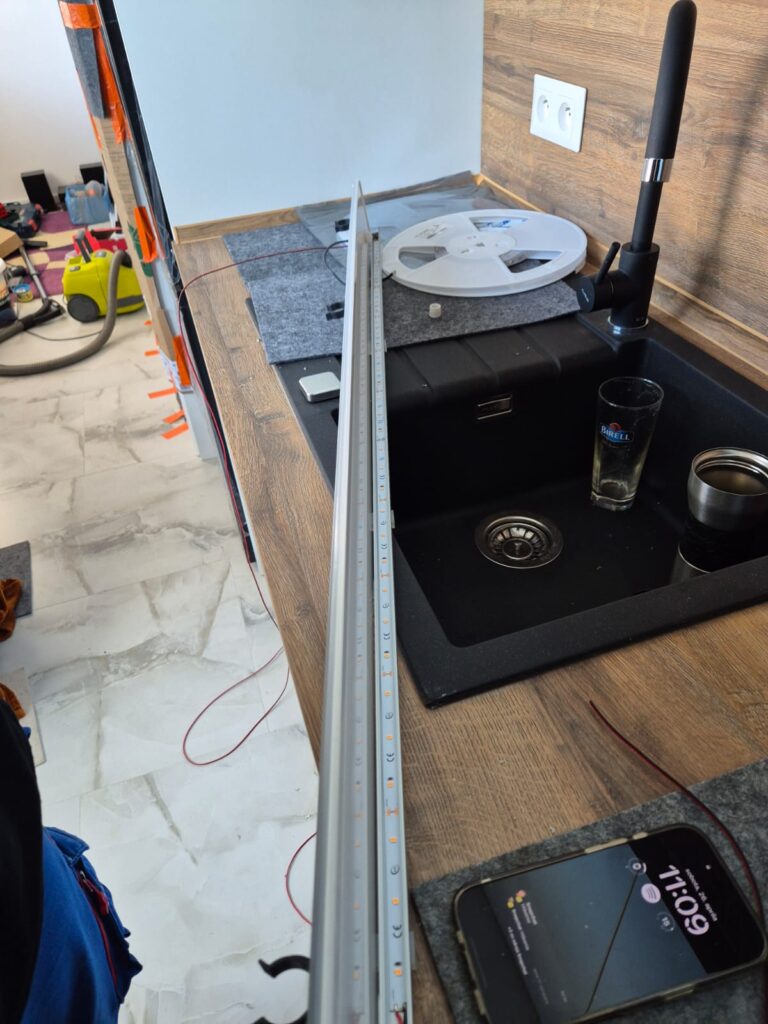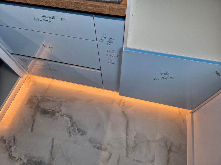Po dohode zo zákazníkom sme pristúpili k montáži LED podsvietenia pod vrchné kuchynské skrinky ako aj na spodok kuchynskej linky.Po zafrezovani pásik bol namontovaný a otestovaný.Následne práca bola odovzdaná zákazníkovi.