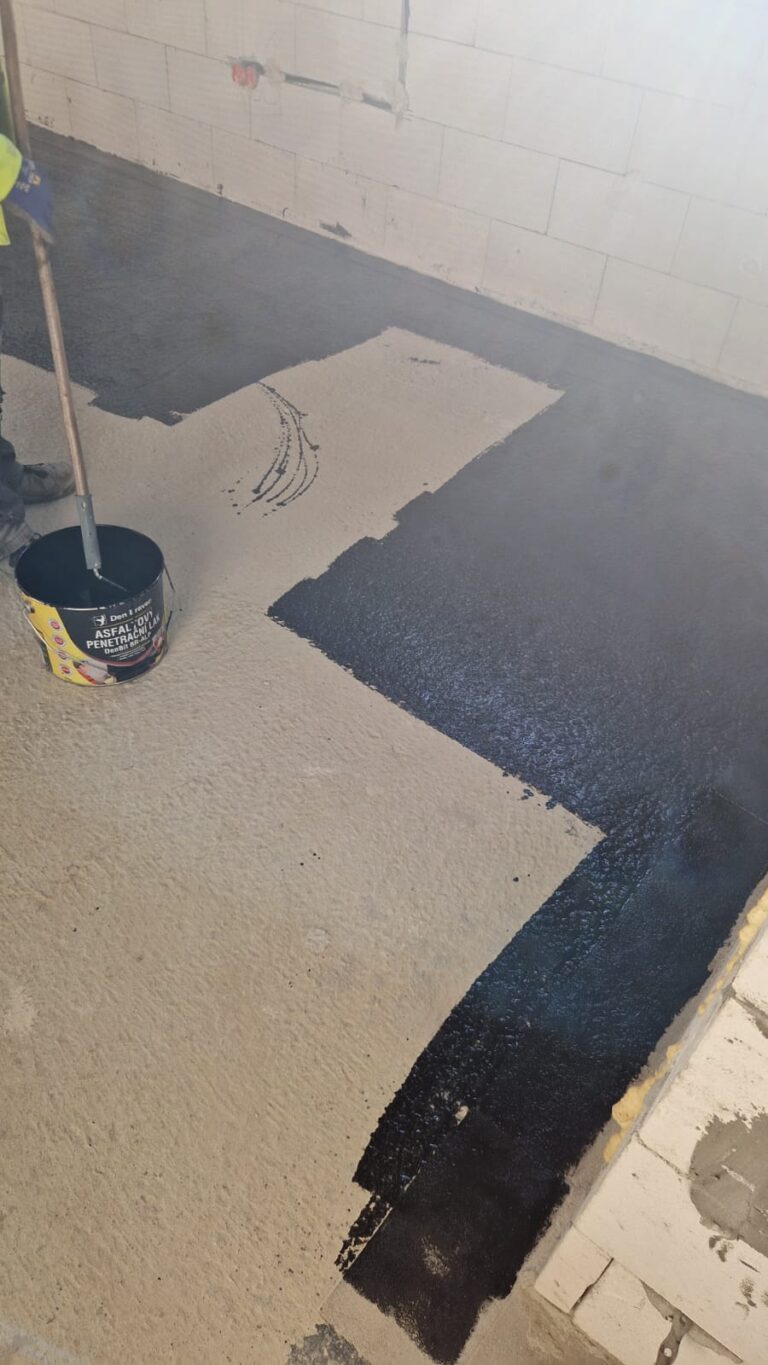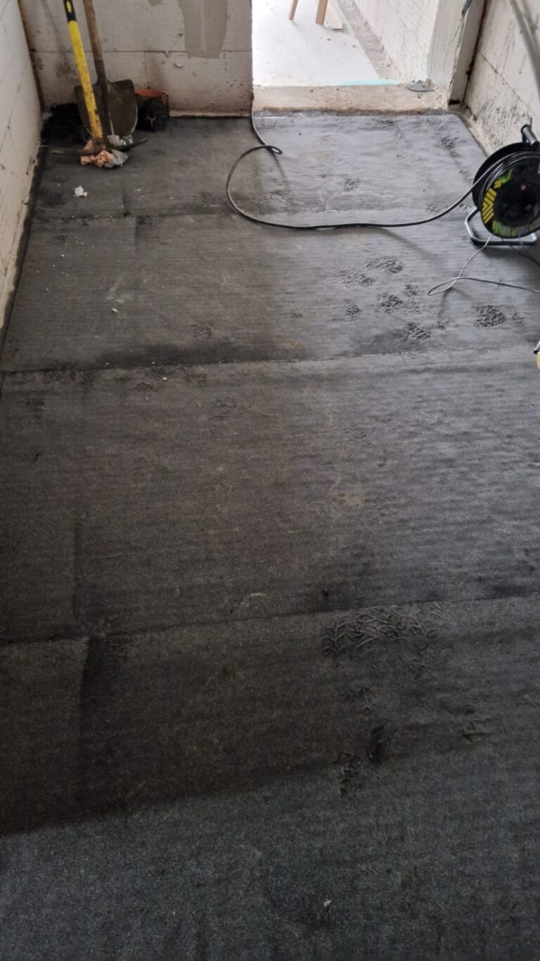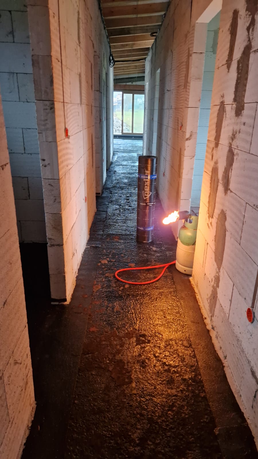 Pokládka hydroizolácie na základovú dosku. Najskôr sme si povrch dôkladne vyčistili a ošetrili aby sme dosiahli dokonalú priľnavosť penetrácie. Po nanesení penetrácie sme pristúpili k tepelnému pájaniu hydroizolácie s preložením minimálne 10cm na lepenku.