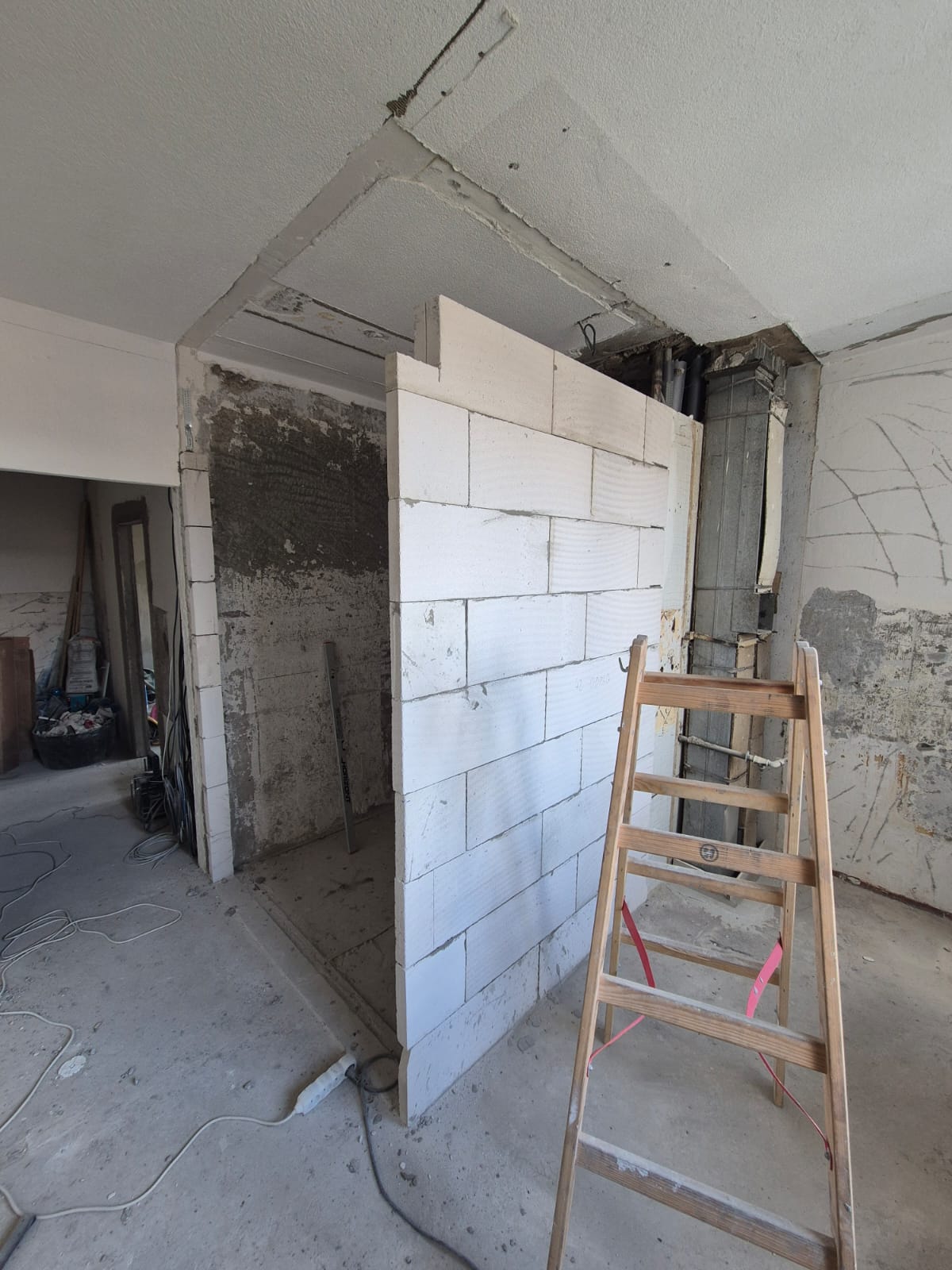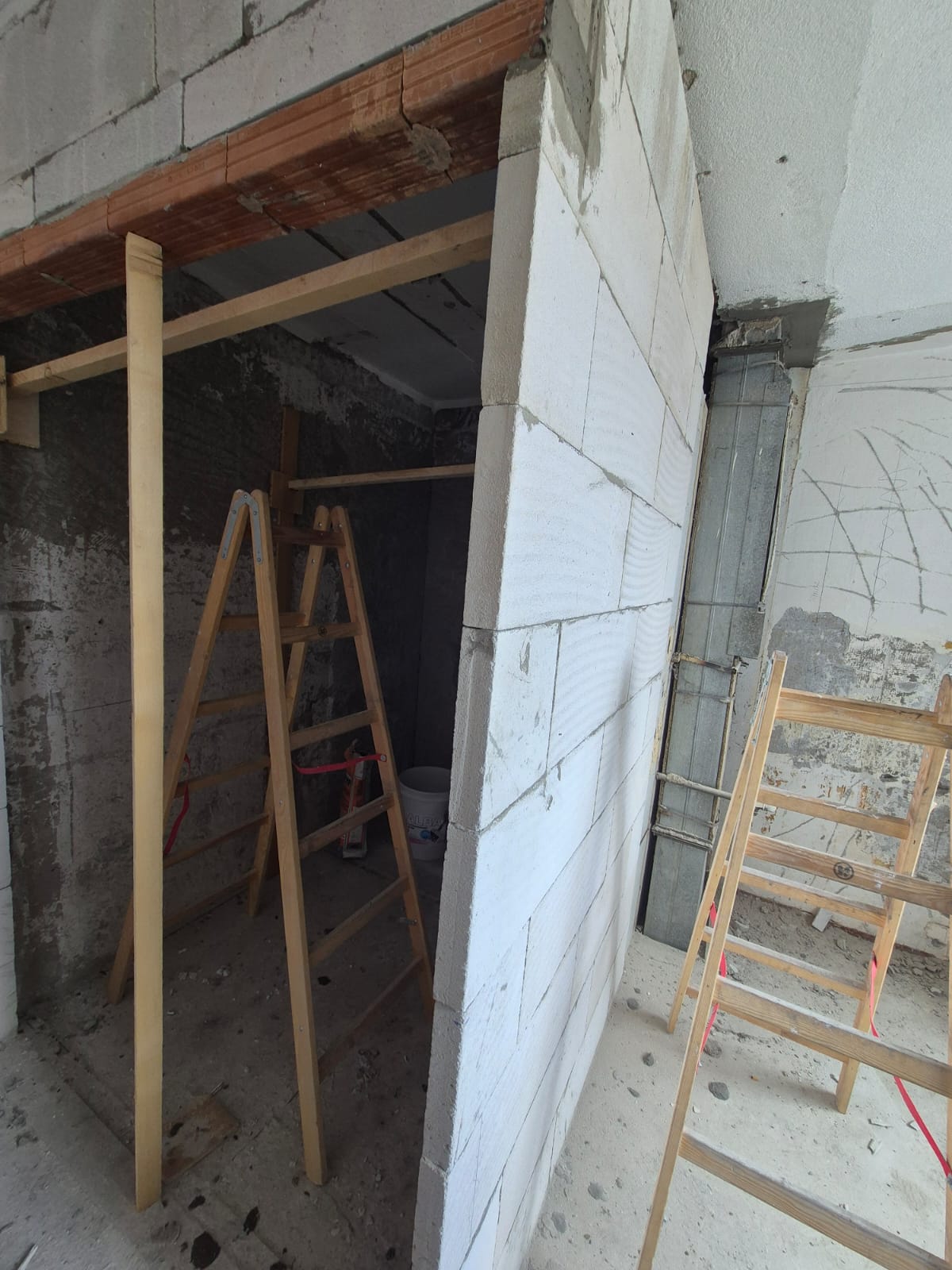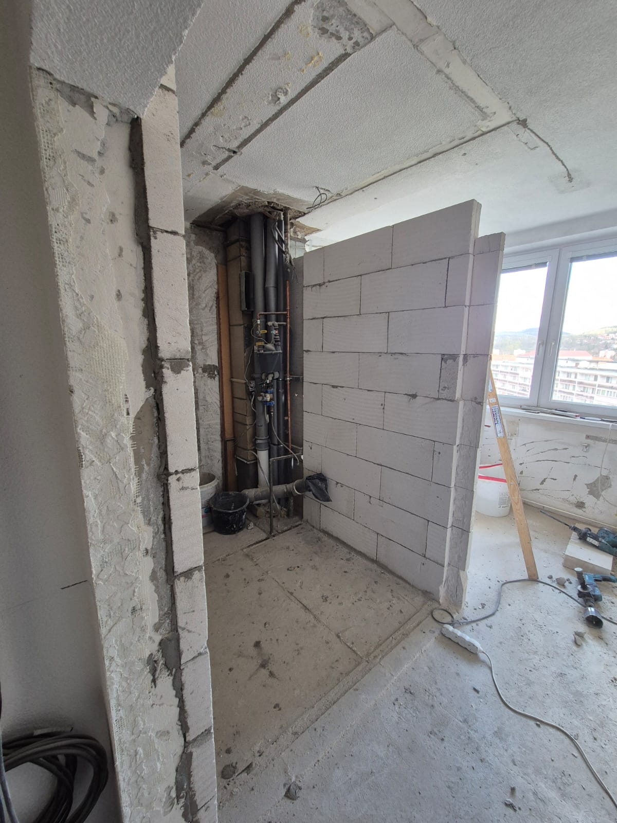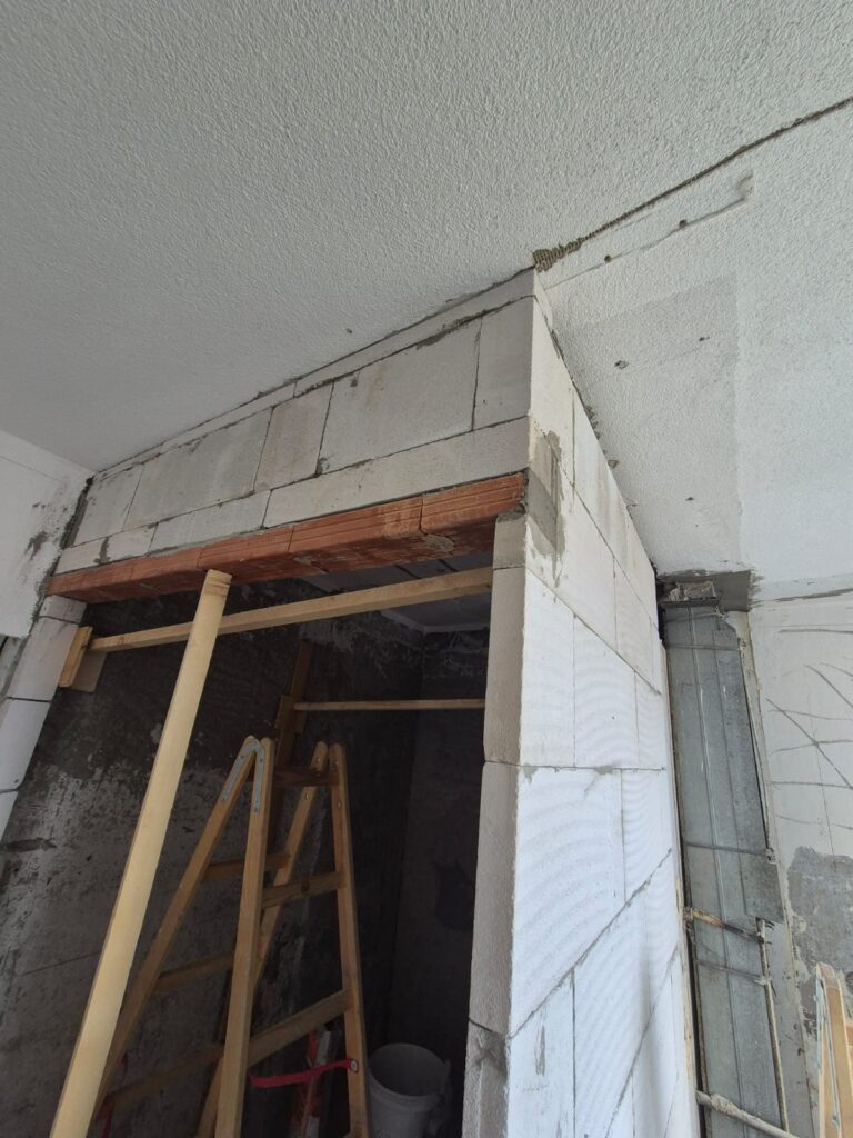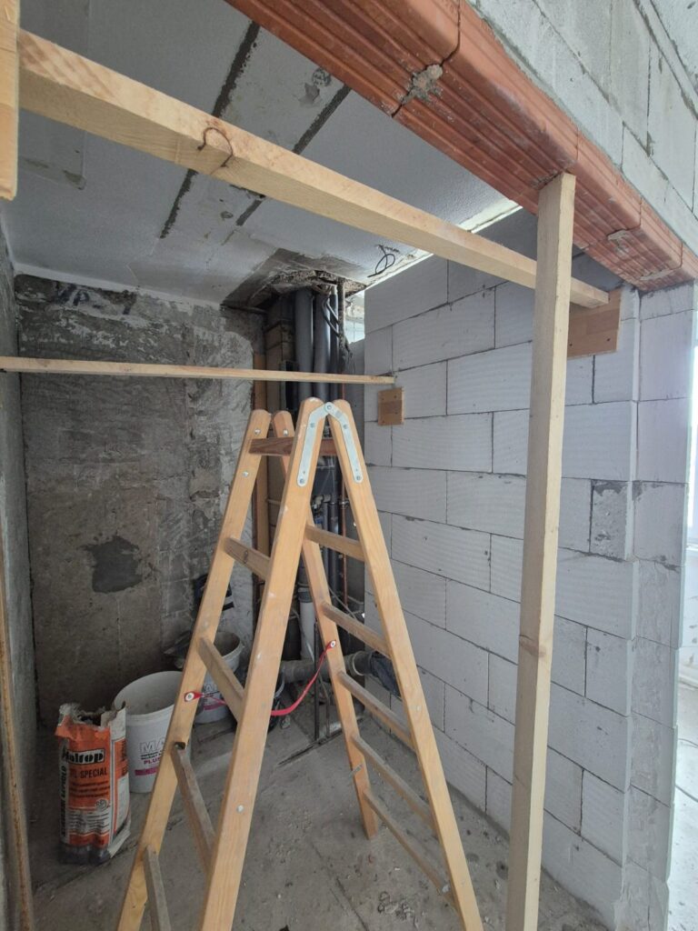 Pred montážou novej kúpelne sme odstránili starú, a začali murovať jadro. Použili sme 10 porfix pre stabilnejšiu stenu a taktiež preklad na dvere ktoré budú v puzdre namontované neskôr.